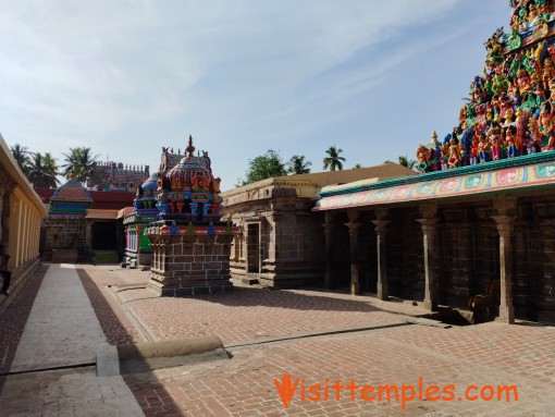 To the left of the Rajagopuram is the Shrine for Yamadharman who is found here along with Chitragupthan and this Shrine is known as Kshethra Baalagar. Some refer this as Ayull Virudhi Sthalam. This Temple is believed to remove the Death Fear (Yama Bayam or Marana Bayam) of Devotees visiting this Temple. There is another three tiered East facing Rajagopuram. On the way to the Moolasthanam is a Prasada Stall, Temple Office and a Sub Shrine for Abhyangara Vinayagar and Bala Murugan. Likewise there is a Adhikara Nandhi and a Shodasha Vinayagar and they have to be Prayed before entering the Moolasthanam. It is said that on the whole this Temple has 16 different Idols of Ganapathy under various names.